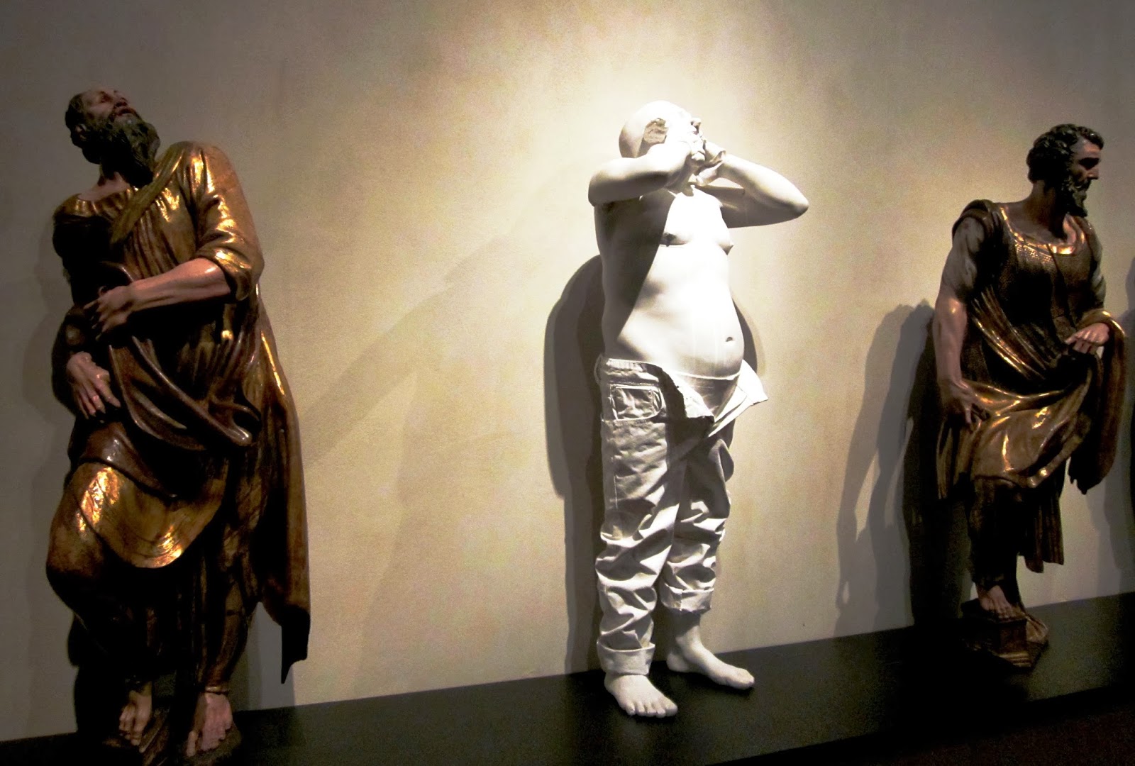 La distorsión creada por las obras de Bernardí Roig en el Museo Nacional de Escultura de Valladolid (Instante blanco, hasta el 12 de enero) coloca al visitante en una inevitable sorpresa de la que saldrá, si sabe aprovecharla, con una grieta que le ayudará a comprender mejor varios conceptos del arte de todos los tiempos pero, especialmente, el contemporáneo. Es de alabar la valentía de la dirección de este Museo al ofrecernos esta sopresa. En una colección que lleva tantos años formalizada se introduce un elemento perturbador que nos provoca una nueva y necesaria mirada. Evidentemente, este juego solo puede ser temporal y no recomiendo visitar por primera vez el Museo ahora. Una apuesta de este tipo solo pueden comprenderla mejor -o rechazarla- los asiduos de la colección con la que se dialoga.