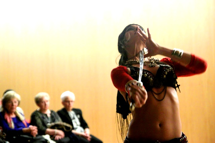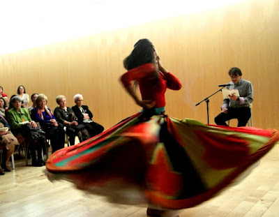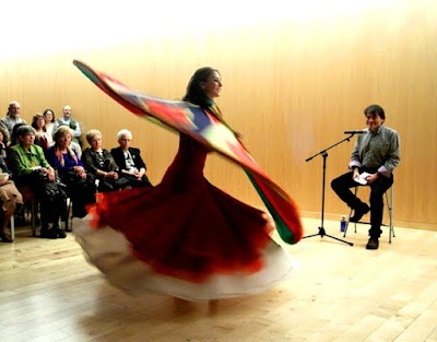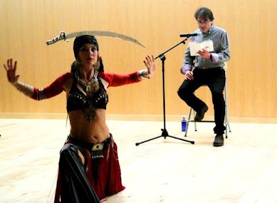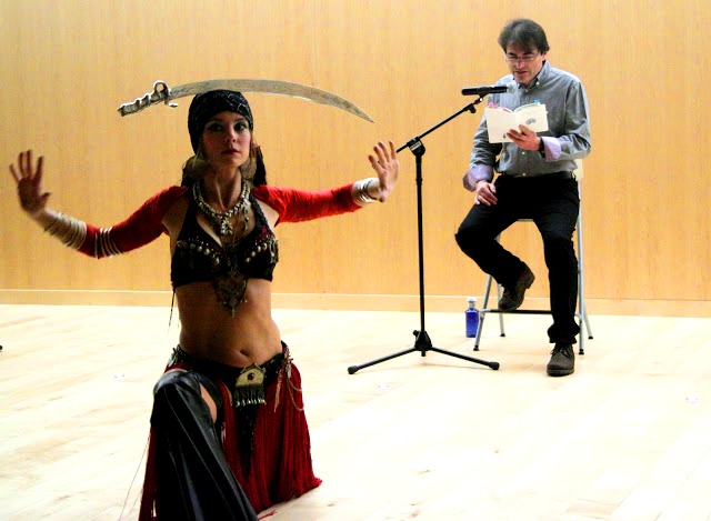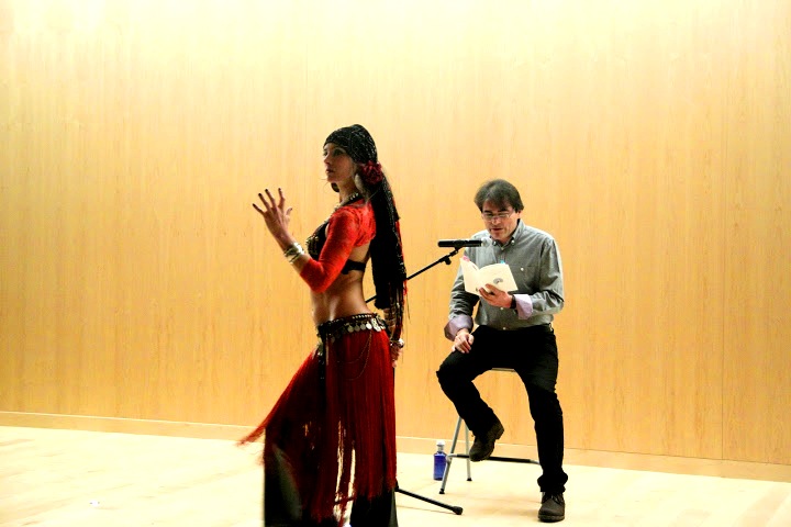 De los tres momentos pueden ser un pequeño testimonio las fotografías que acompañan esta entrada. El primero de ellos resulta impactante puesto que es la lucha del personaje por su liberación e independencia para alcanzar su personalidad; el segundo resulta delicadamente lírico y se corresponde con el hallazgo del amor, para el que quisimos ajustar hasta las tonalidades cromáticas con las mencionadas en los poemas recitados; el tercero es la liberación definitiva del personaje, que Neftis Paloma interpretó con el giro sufí, en el que es una especialista. Entre cada una de las piezas recité poemas del libro contando algunas anécdotas sobre cómo fueron concebidos y procurando evitar mi oficio de profesor y dar más explicaciones para que los poemas hablaran por sí mismos.