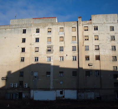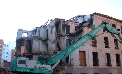 Este edificio, como un gran navío varado, aguarda a que el precio del solar compense su derribo. Cuando lo abandonaron, los fantasmas dejaron abiertos hacia la noche los grandes balcones y el edificio vacío mostró sus entrañas al viento y la lluvia. Al amanecer, la rabia del sol agrietó sus paredes y desencajó las mandíbulas de las habitaciones asoladas. Sus moradores, espantados, debieron sentir el vértigo del derrumbe y dejaron tendida la última colada en los frágiles tendederos. En los huecos de las escaleras aun resuenan sus apresurados pasos en fuga.
